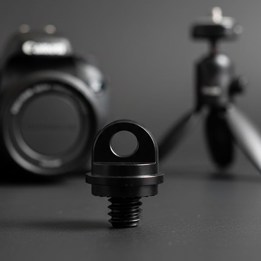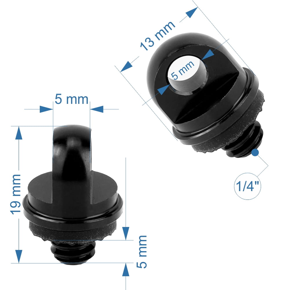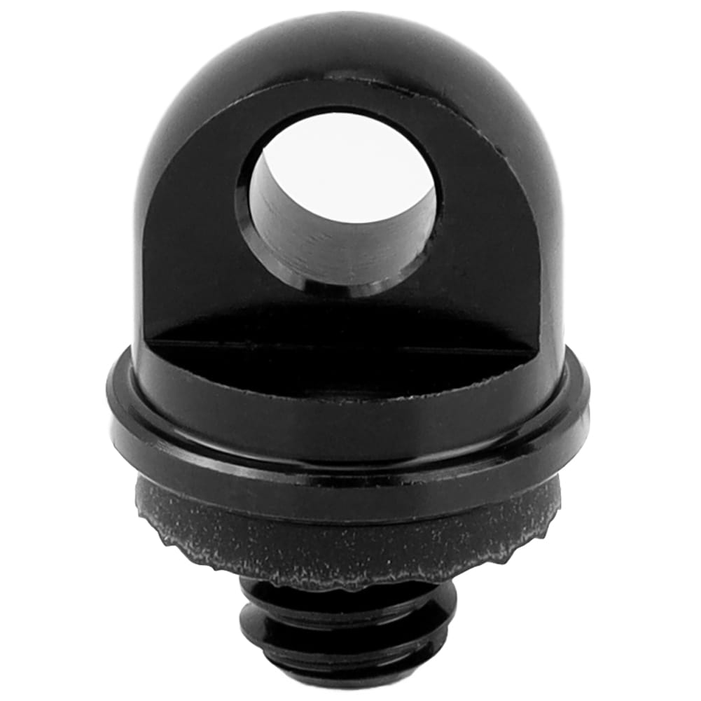 Śruba statywowa 1/4" z uchem wykonana z aluminium w kolorze czarnym. Do pasków, smyczy i linek zabezpieczających sprzęt foto-wideo.